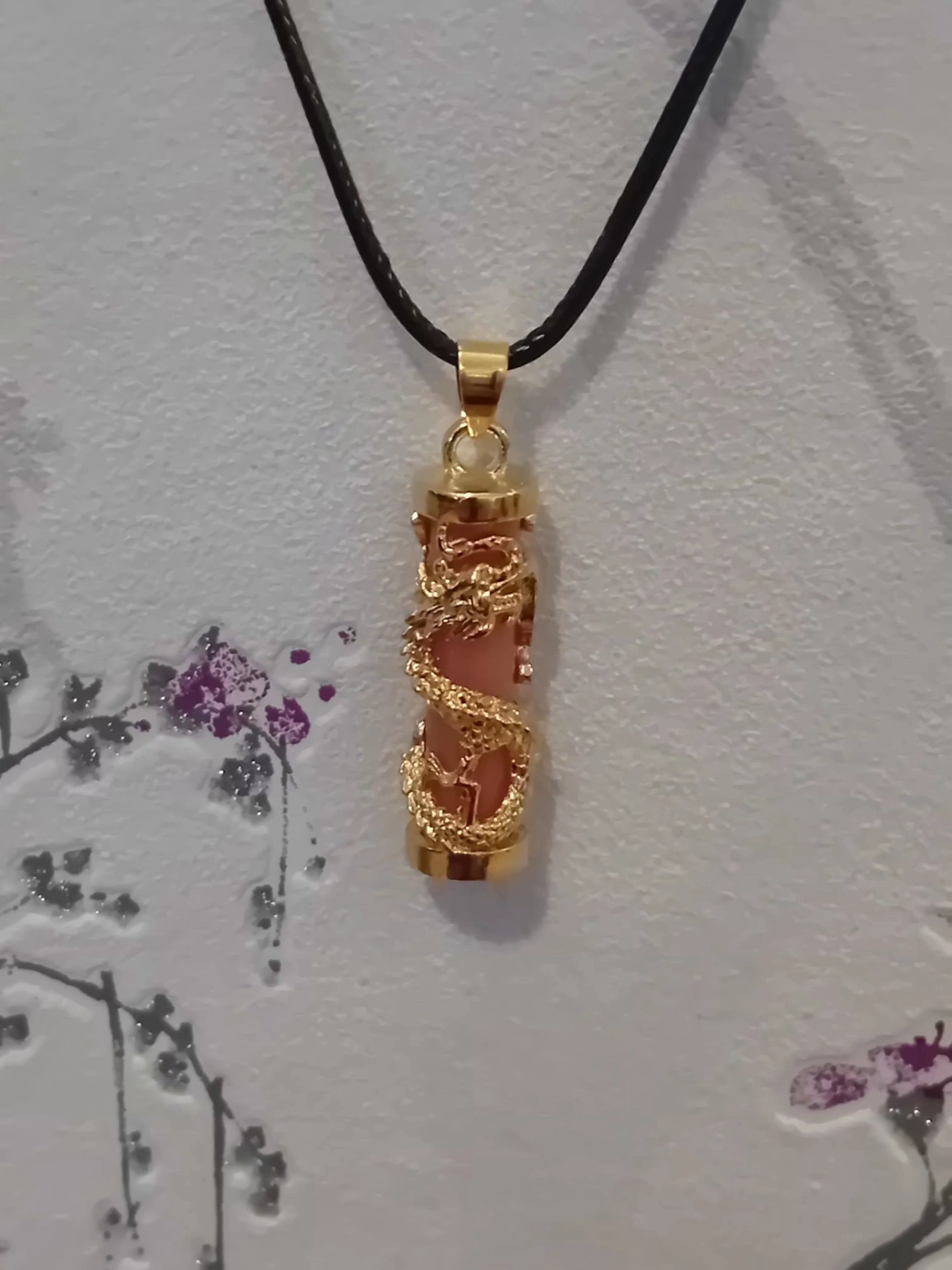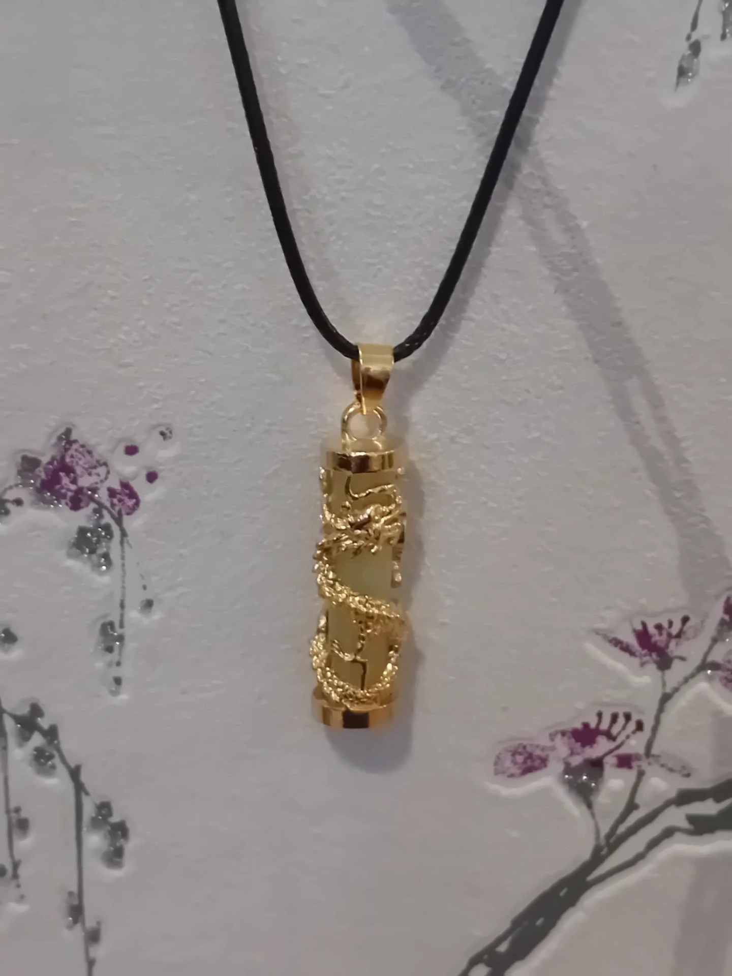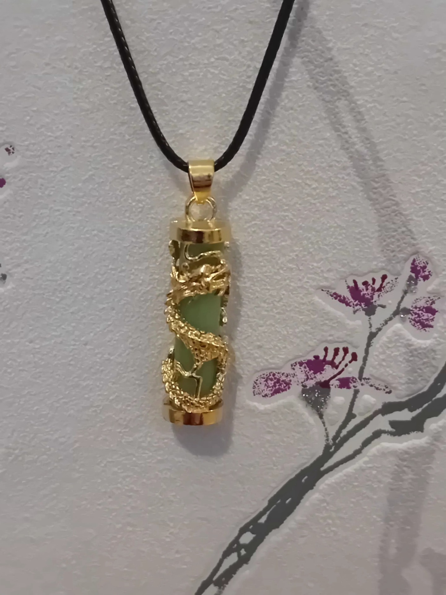 Kaunis lohikäärme aiheinen kivivikoru kullattua sinkkiseosta ja värjätty vihreä kristalli. korun pituus 4,3cm leveys 1cm Nyöri nylonsekote. Pituus 45 cm jossa jonkun verran säätövaraa. Hammaslukko kiinnitys.