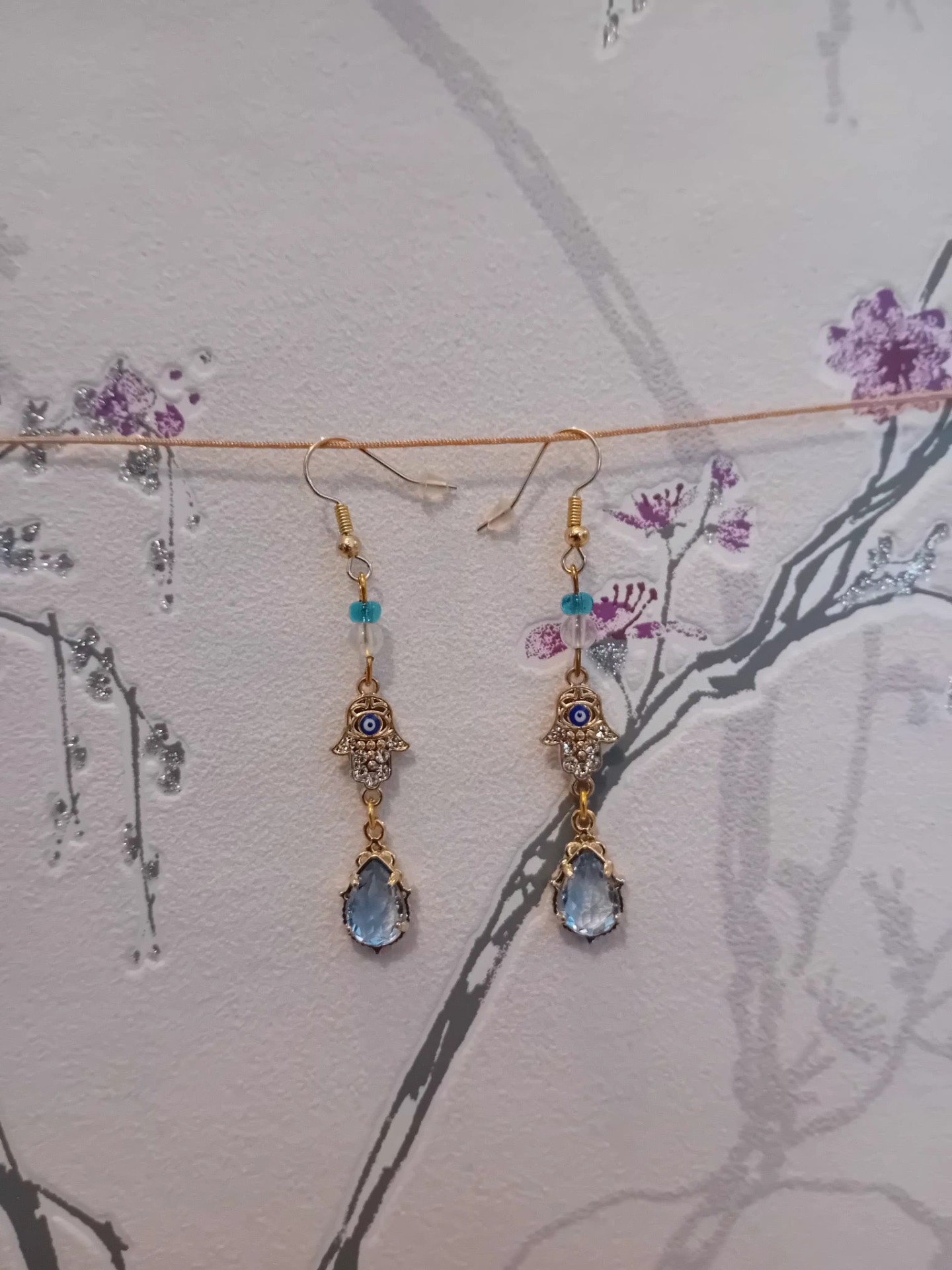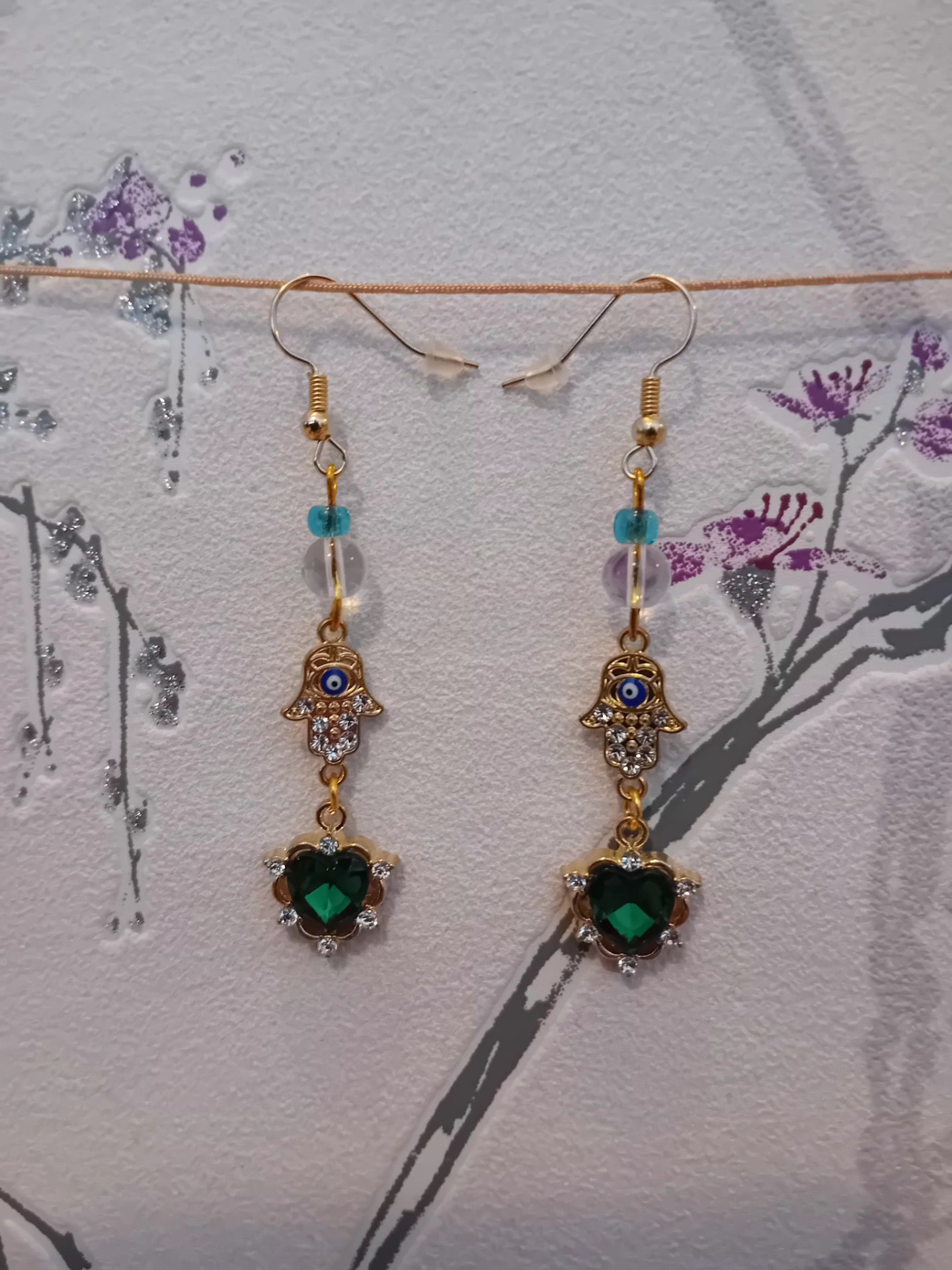 Upeat ja näyttävät korvarenkaat. värjätut vuorikidekristallit välissä kullan sävyiset metaĺliset välihelmet Rengas ruostumaton teräs ja koko halk 3cm korviksen pituus n. 5 cm