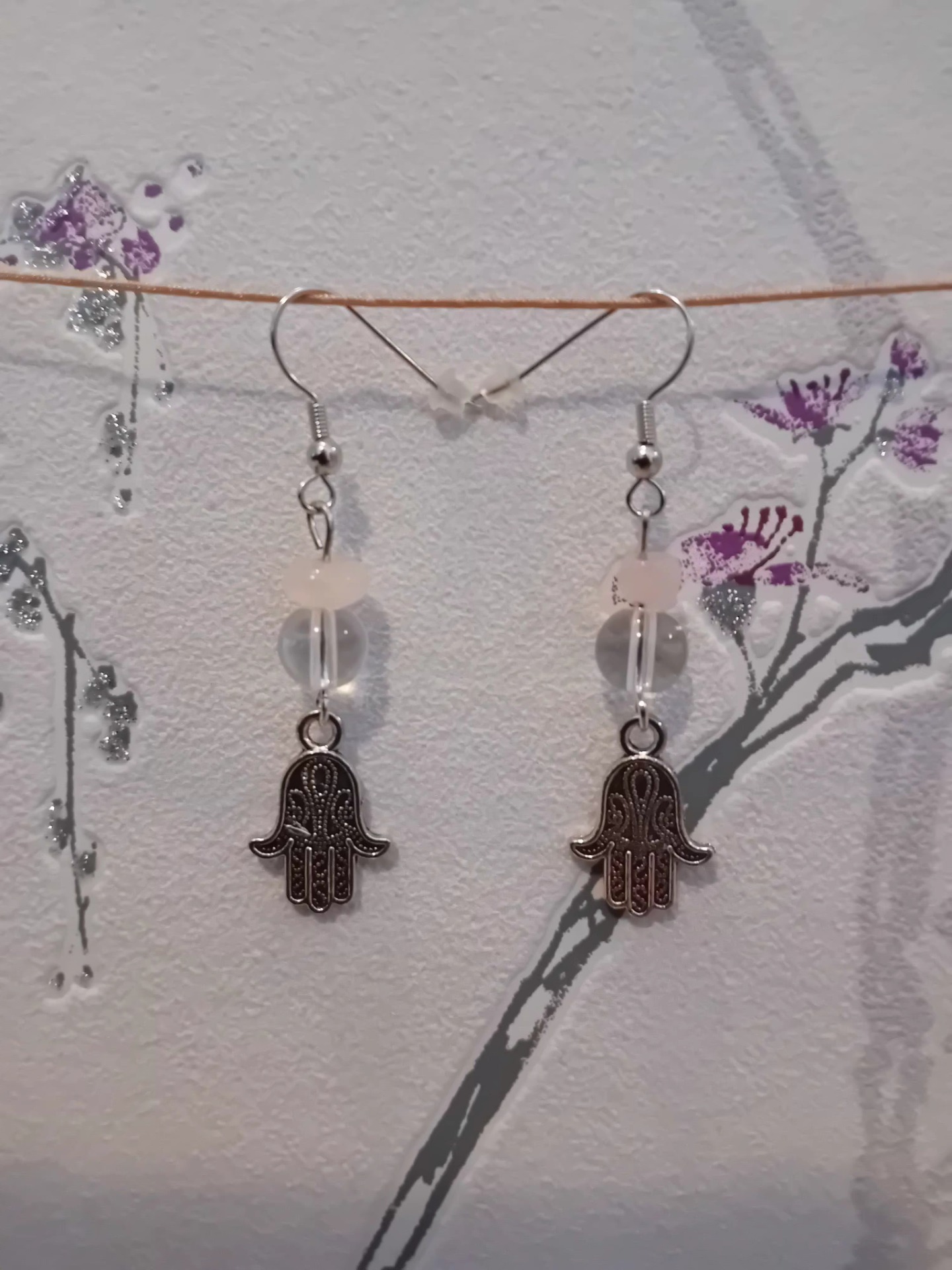Upeat ja näyttävät korvarenkaat. vuorikidekristallit välissä hopean sävyiset metaĺliset välihelmet Rengas ruostumaton teräs ja koko halk 3cm korviksen pituus n. 5 cm